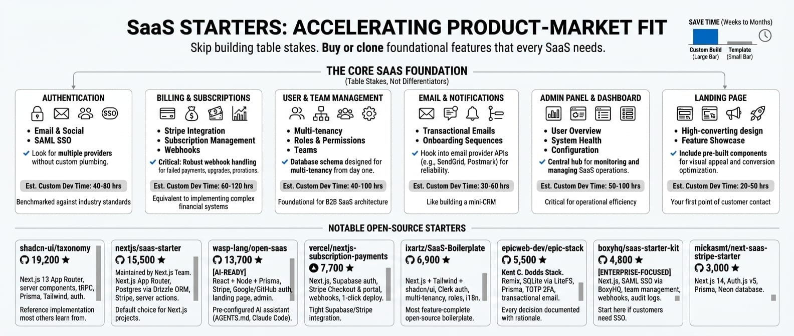 A good SaaS template saves you the most time of any category. The reason: every SaaS app needs the same foundation. Auth (email, social, SSO). Billing (Stripe integration, subscription management, webhooks). User management (teams, roles, permissions). Email (transactional, onboarding sequences). Landing page. Admin panel. These are table stakes, not differentiators.