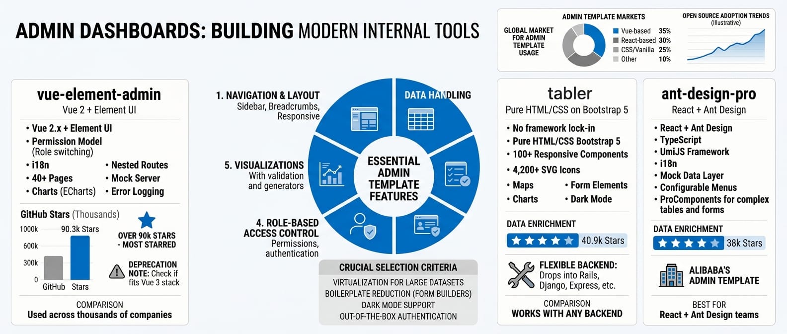 PanJiaChen/vue-element-admin (90,300 stars). Contains: Vue 2 + Element UI, 40+ pages, permission model with role switching, i18n, charts (ECharts), nested routes, breadcrumbs, mock server, error logging. The most starred admin template on GitHub. Used across thousands of companies. Vue 2, so check if that fits your stack.