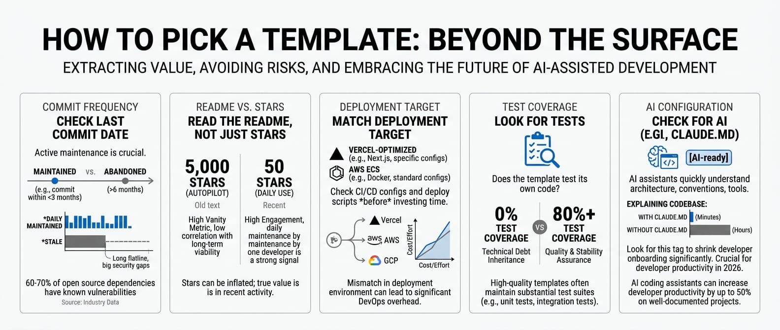 Match your deployment target. A Vercel-optimized template won't help if you're deploying to AWS ECS. Check the CI/CD configs and deploy scripts before you invest time.