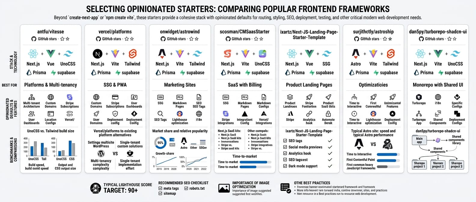 When create-next-app or npm create vite isn't enough. These starters add opinionated defaults: routing, styling, SEO, deployment configs, testing.