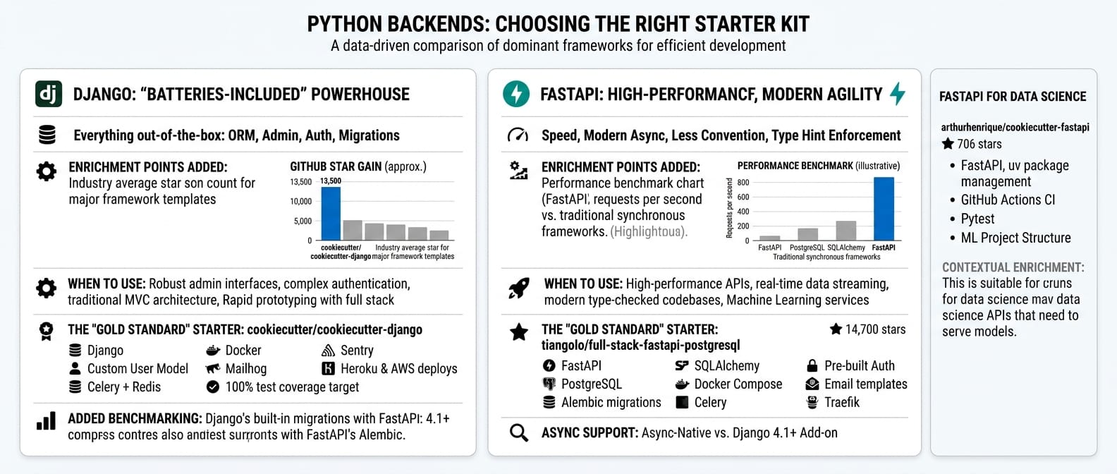 What to look for: async support if you need it (FastAPI is async-native, Django added it in 4.1+). Database migrations via Alembic (FastAPI) or Django's built-in system. Type hints throughout (FastAPI enforces this, Django benefits from it). Celery or equivalent for background tasks. Docker setup with proper health checks.