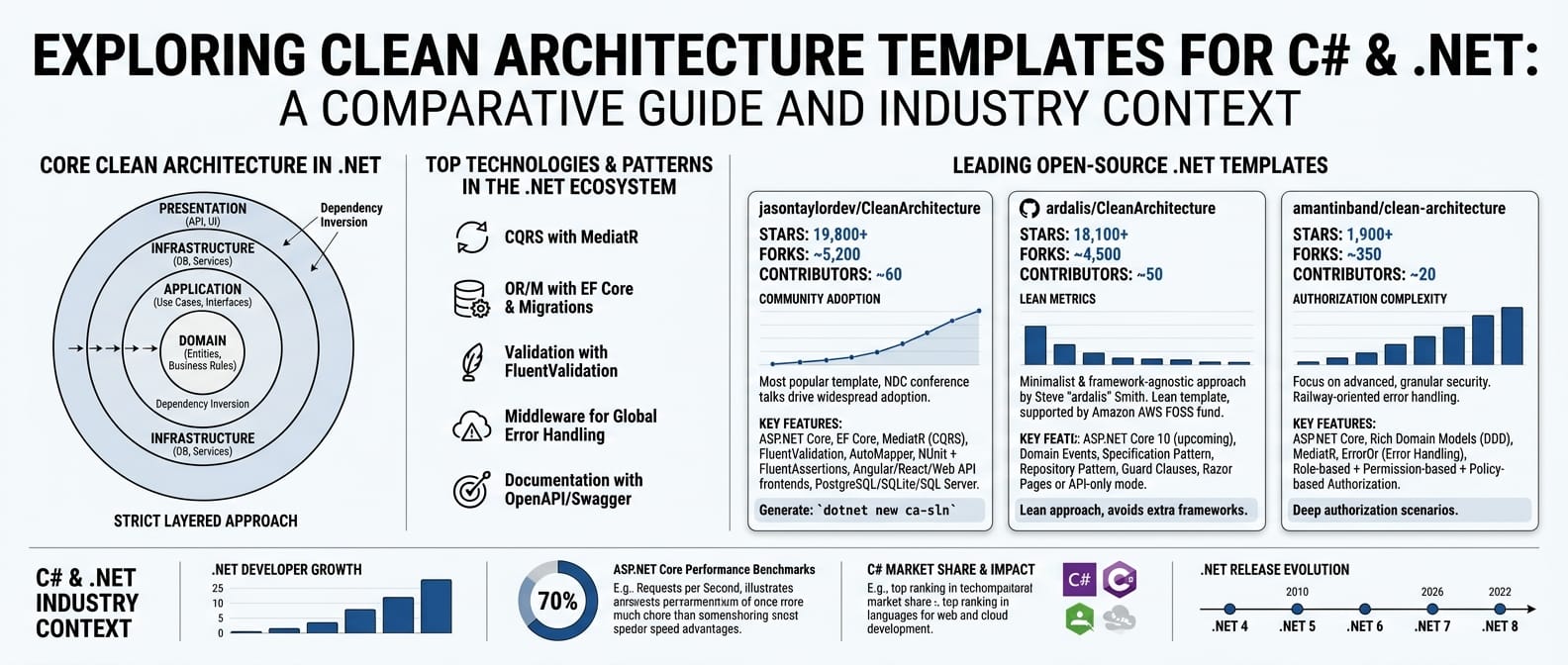 The .NET world takes Clean Architecture seriously. The top templates follow a strict layered approach: Domain (entities, business rules), Application (use cases, interfaces), Infrastructure (database, external services), and Presentation (API controllers, UI).