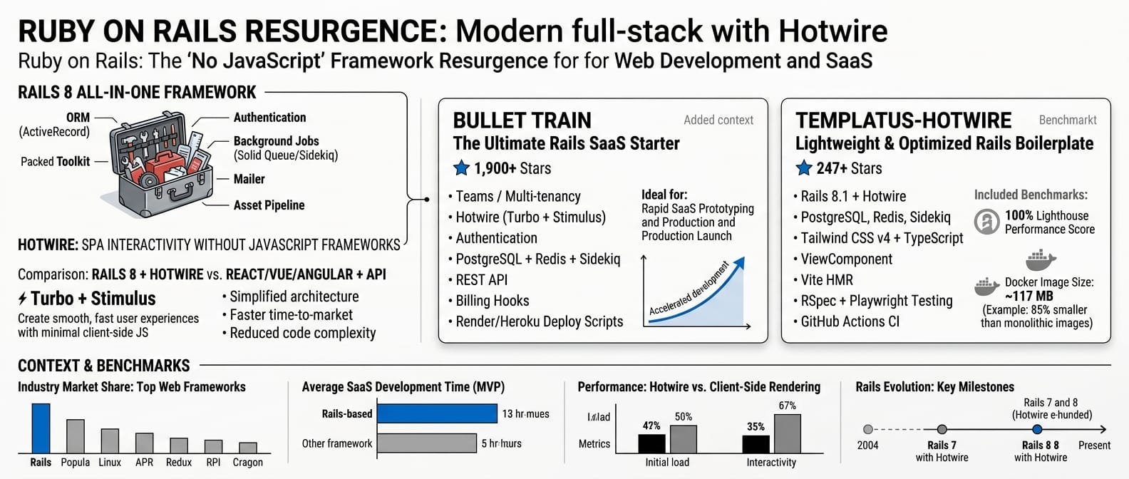 Rails has had a resurgence. The framework ships with everything (ORM, auth, jobs, mailer, asset pipeline), so the question isn't "what do I need" but "what's the best starting configuration." Rails 8 with Hotwire (Turbo + Stimulus) gives you single-page-app-like interactivity without a JavaScript framework.