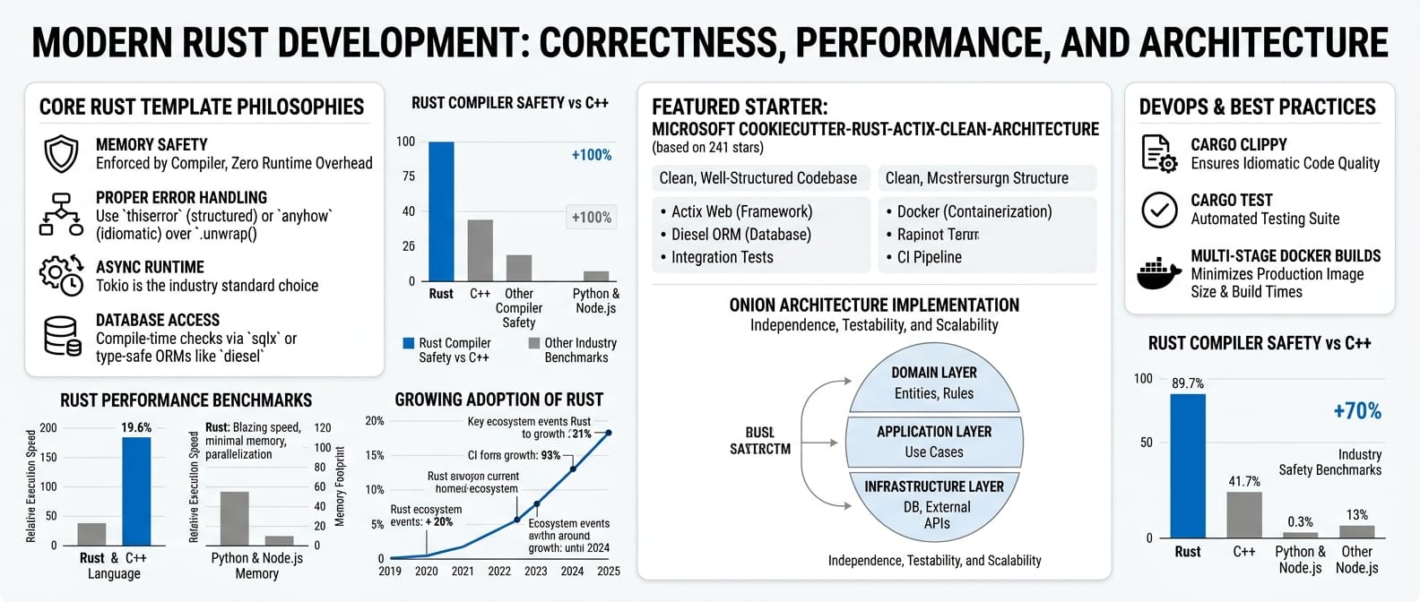 Rust templates focus on correctness and performance. The compiler enforces memory safety, but project structure, error handling patterns, and async runtime choices are left to you.
