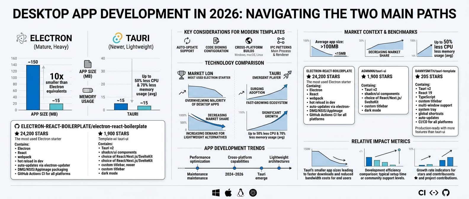 Desktop development has two main paths in 2026: Electron (mature, heavy, Chromium-based) and Tauri (newer, lightweight, uses the OS webview). Both need templates because the build tooling is complex.