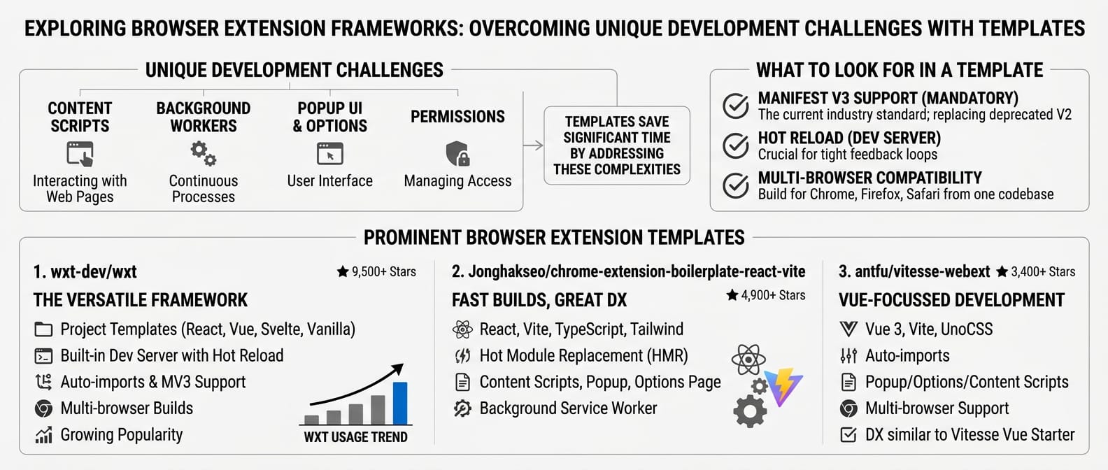 wxt-dev/wxt (9,500 stars). Contains: a framework with project templates for React/Vue/Svelte/Vanilla, built-in dev server with hot reload, auto-imports, MV3 support, multi-browser builds. Becoming the default choice for new extensions.