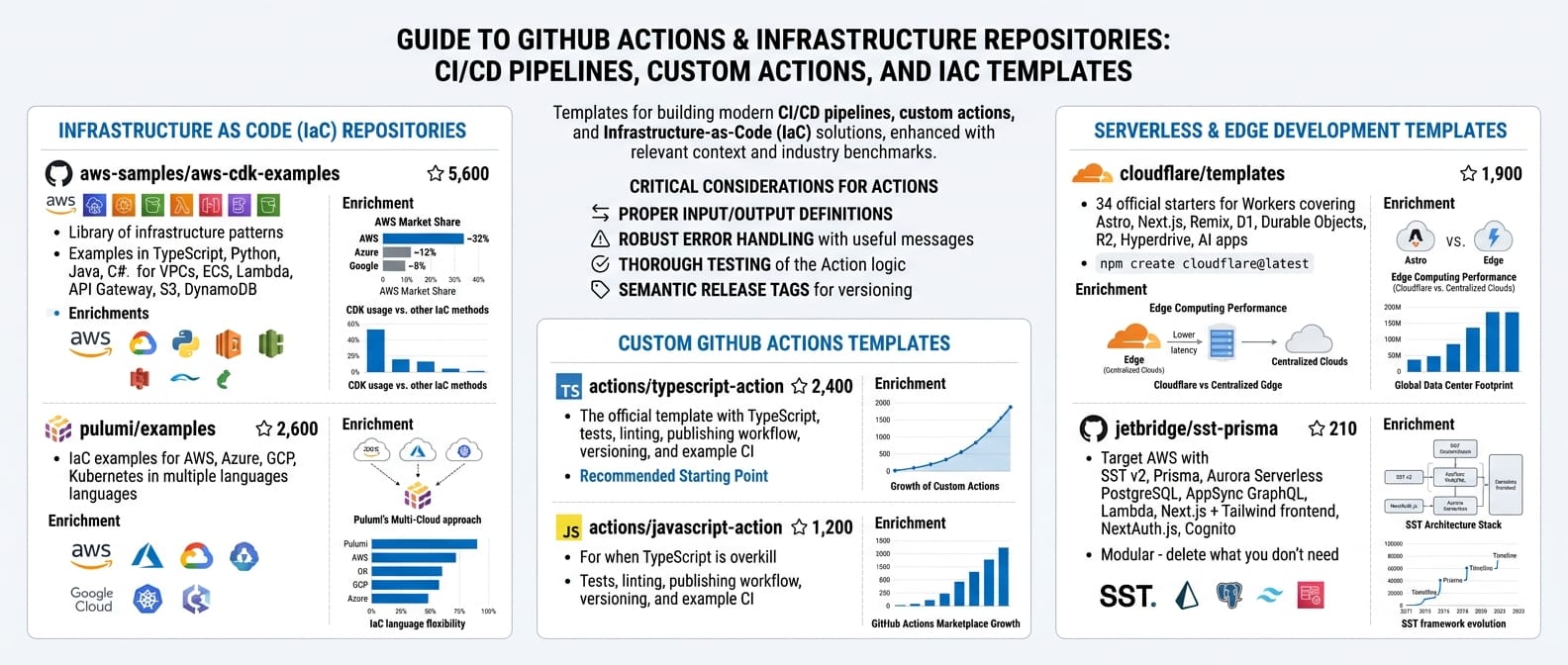 Templates for building CI/CD pipelines, custom actions, and infrastructure-as-code.