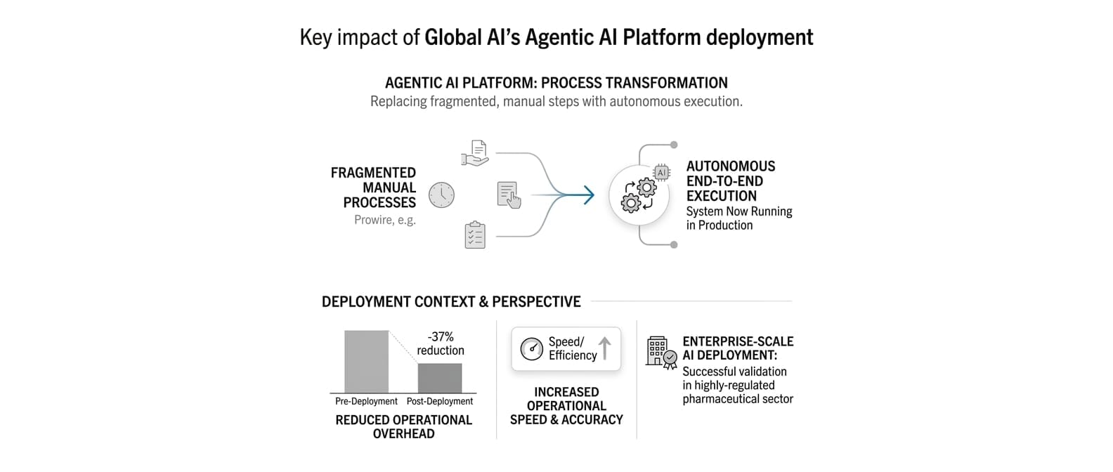 Global AI secured a major production deployment of its Agentic AI Platform with one of the largest pharmaceutical companies globally. With this deployment, Global AI is redefining how large enterprises operate - replacing fragmented, manual processes with autonomous, AI-driven execution. The system is now running end-to-end in production, significantly reducing operational overhead while increasing speed, accuracy, and compliance.