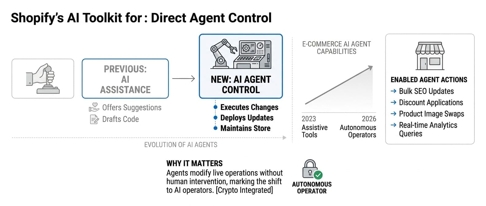 Why it matters: This moves beyond AI assistance to actual AI control - agents can now modify live e-commerce operations without human intervention, signaling the shift from AI tools to AI operators.