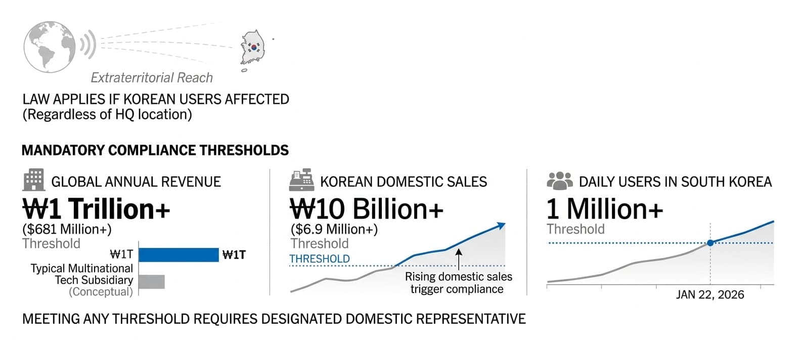 The thresholds for mandatory compliance are specific: global annual revenue above 1 trillion KRW ($681 million), Korean domestic sales above 10 billion KRW ($6.9 million), or at least 1 million daily users in South Korea. If you hit any of those, you need a designated domestic representative in Korea.