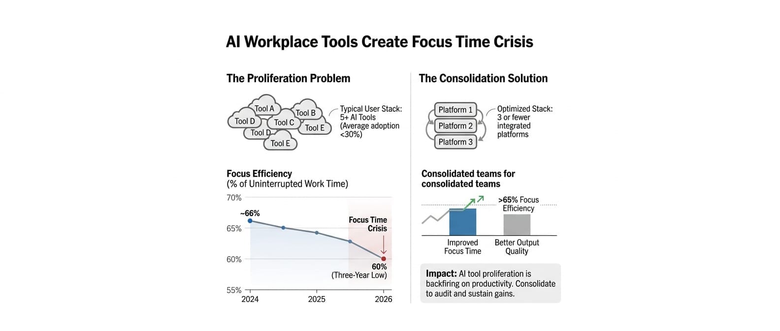 Impact: AI tool proliferation is backfiring on productivity gains, forcing organizations to audit and consolidate their AI stack for sustainable adoption.