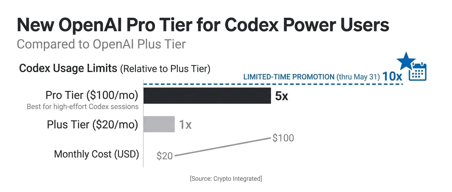 OpenAI introduced a new $100/month Pro tier offering 5x more Codex usage than Plus, with a limited-time 10x promotion through May 31st. This new tier offers 5x more Codex usage than Plus and is best for longer, high-effort Codex sessions.