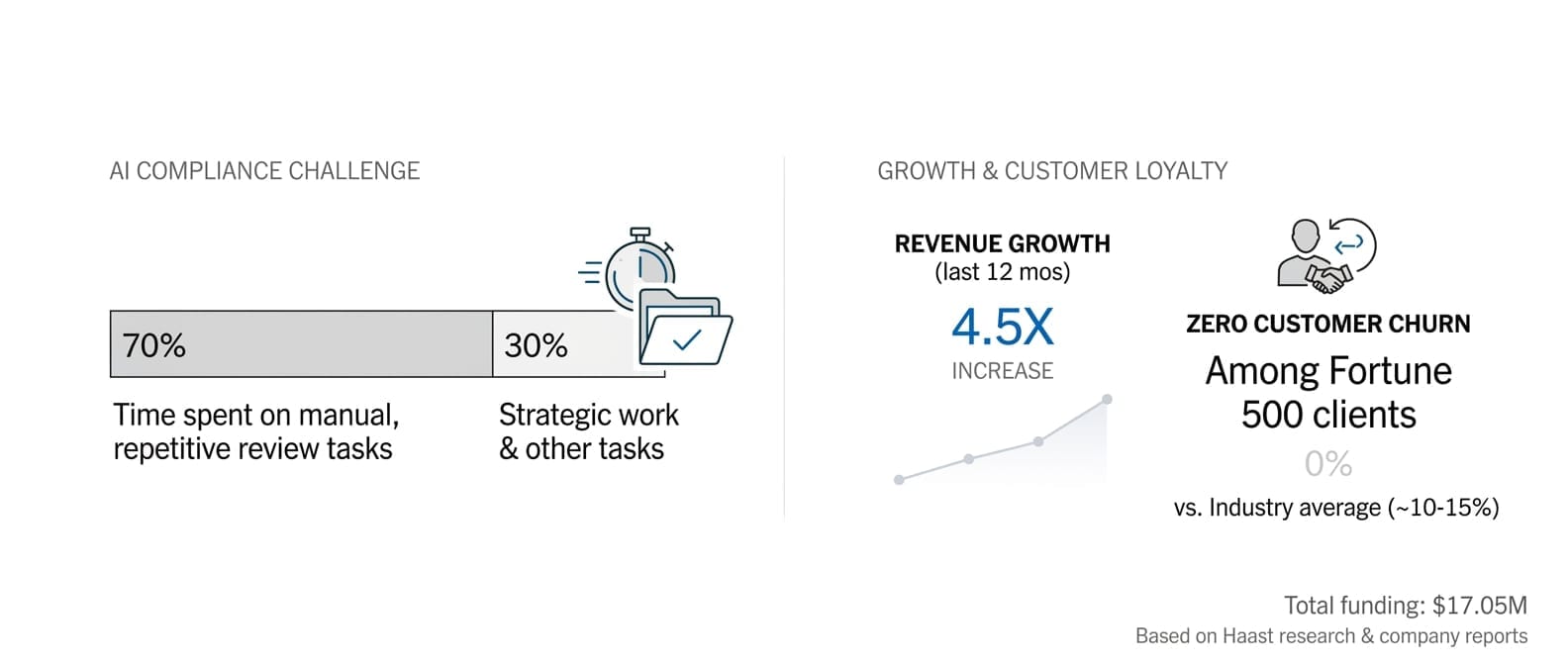 Haast automates compliance workflows for enterprises drowning in AI-generated content that needs legal and regulatory review. The numbers behind this are striking: compliance and legal teams spend 70% of their time on manual, repetitive review tasks, according to Haast's research. The company reports 4.5x revenue growth over 12 months and zero customer churn among its Fortune 500 clients.