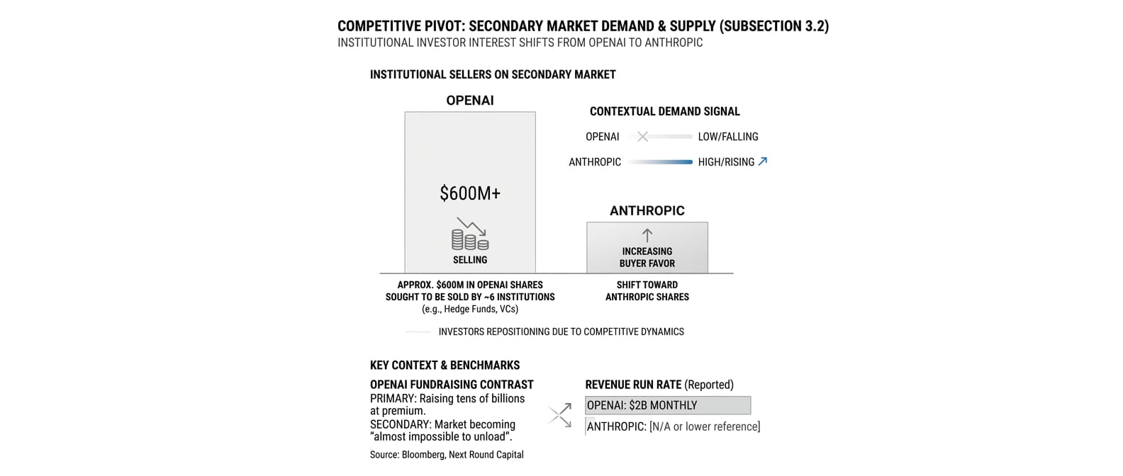 Why it matters: Secondary market sentiment often signals early institutional confidence shifts ahead of public markets, suggesting investors are repositioning based on competitive dynamics rather than just financial metrics.