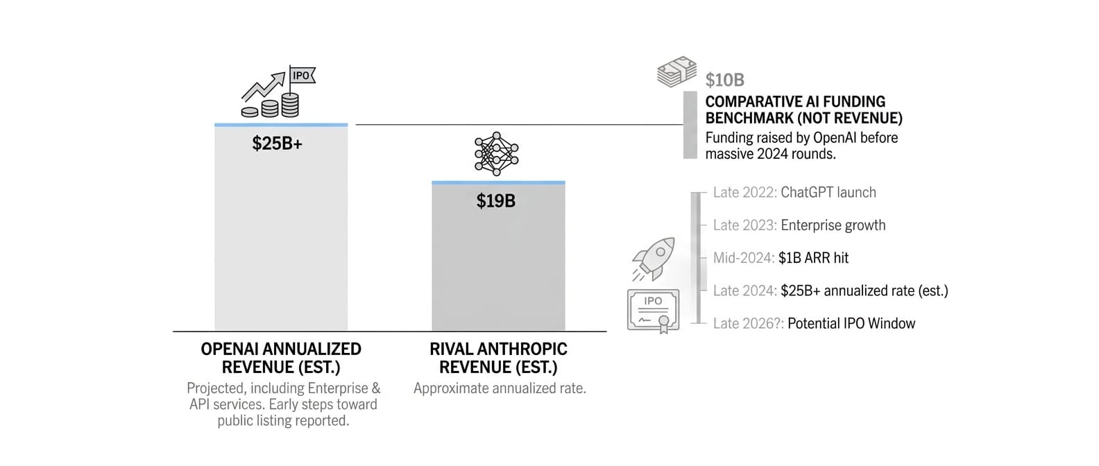 OpenAI has surpassed $25 billion in annualized revenue and is reportedly taking early steps toward a public listing, potentially as soon as late 2026.