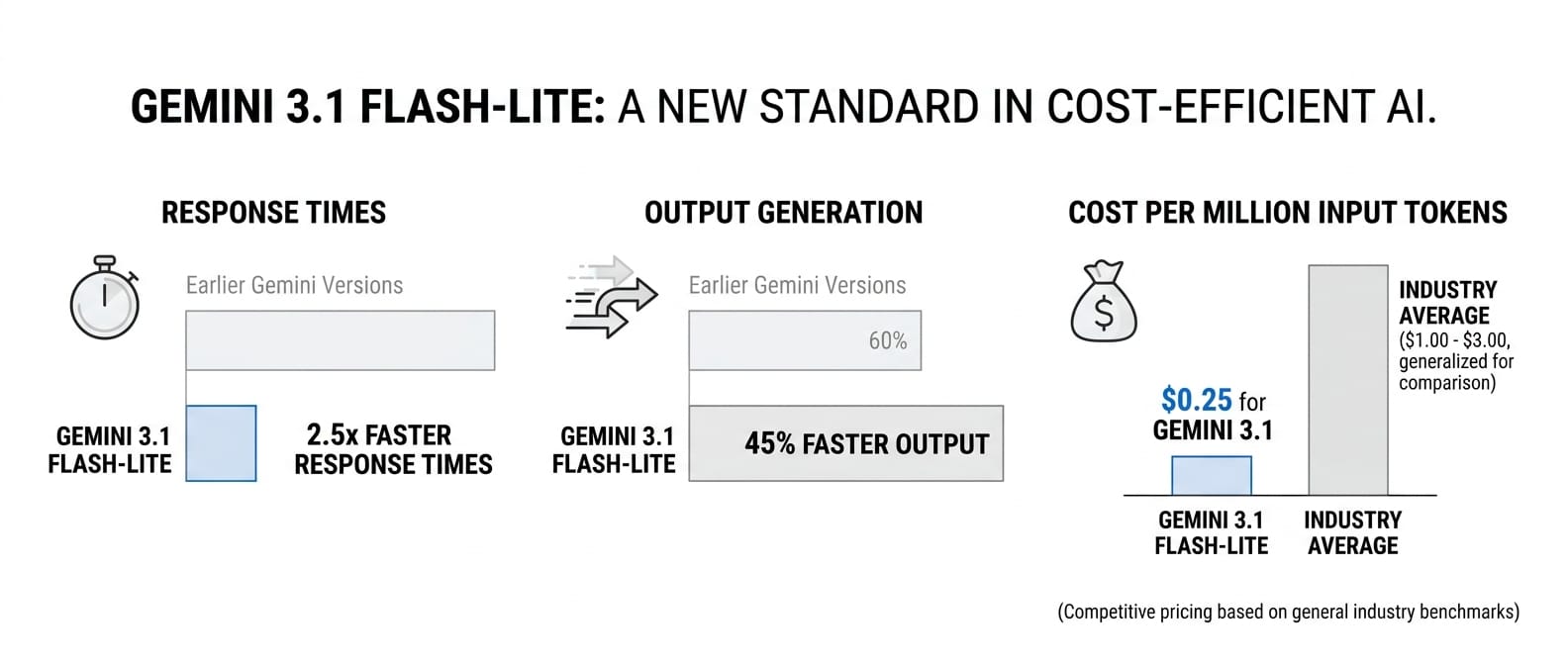 Google introduced Gemini 3.1 Flash-Lite, a new efficiency-focused model delivering 2.5× faster response times and 45% faster output generation compared to earlier Gemini versions, priced at just $0.25 per million input tokens.