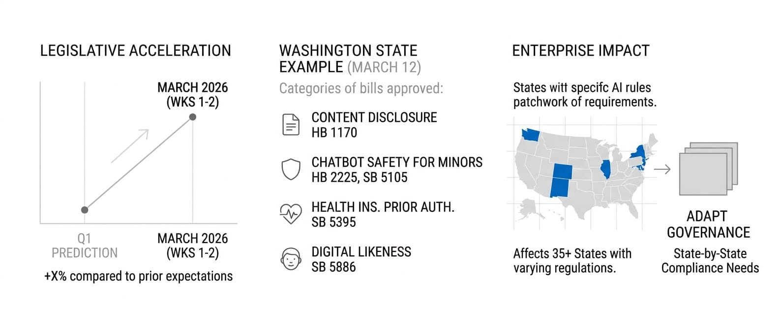 The first two weeks of March 2026 produced more enacted state AI legislation than most observers expected for the entire quarter. Washington's legislature adjourned on March 12 after giving final approval to five AI-related bills, including HB 1170 (AI content disclosure), HB 2225 (chatbot safety for minors), SB 5395 (AI in health insurance prior authorization), SB 5105 (AI deepfakes and minors), and SB 5886 (digital likeness protections).