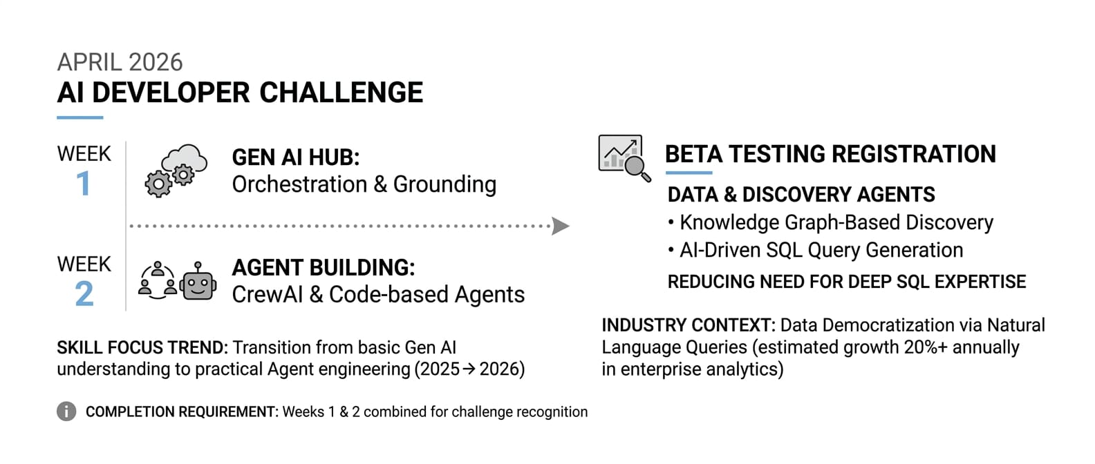 In the first week, you will learn how to use the orchestration service and the grounding module all in Gen AI Hub on SAP AI Core. In the second week you will learn how to build a code based agent using CrewAI and Generative AI hub.