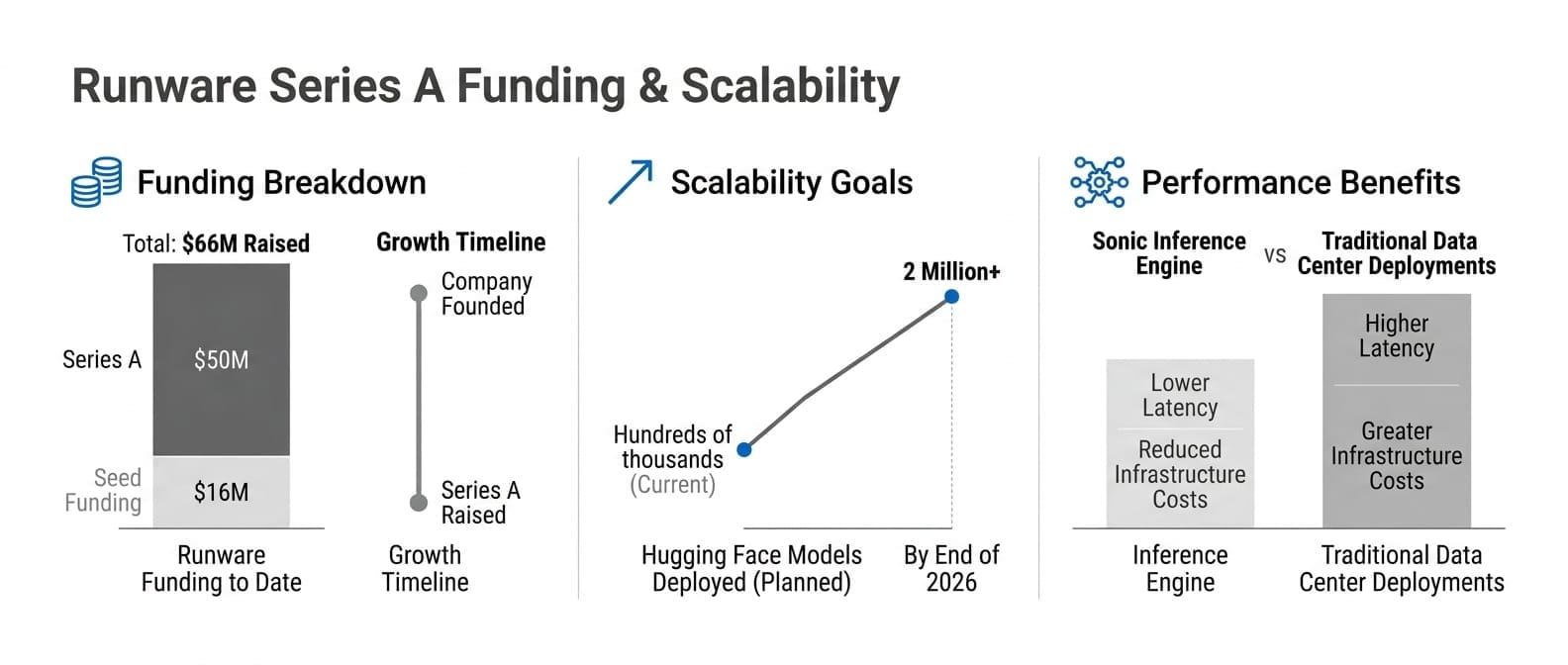 Runware announced $50 million in Series A funding to scale its "Sonic Inference Engine," which optimizes generative AI performance and provides a single API that aggregates hundreds of thousands of AI models, offering significantly faster speeds and lower costs compared to traditional data center deployments. With a total of $66 million raised to date, Runware plans to expand its platform and deploy over two million models from Hugging Face by the end of 2026.
