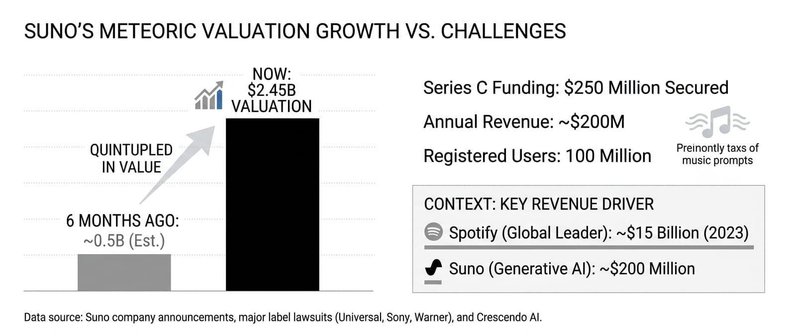 Suno secured $250 million in Series C funding, bringing its valuation to $2.45 billion - nearly quintupling its value in just six months. The raise comes despite high-profile copyright lawsuits from major record labels (Universal, Sony, and Warner), with investors betting on Suno's rapid growth as the startup has reached $200 million in annual revenue from its 100 million registered users who generate full songs from text prompts.