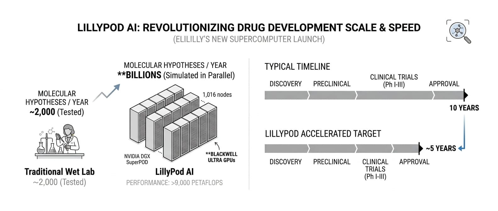 Eli Lilly inaugurated LillyPod, the pharmaceutical industry's most powerful AI supercomputer, built on an NVIDIA DGX SuperPOD with 1,016 Blackwell Ultra GPUs delivering over 9,000 petaflops of performance. Where traditional wet labs test roughly 2,000 molecular hypotheses per year, LillyPod can simulate billions in parallel, with Lilly aiming to use the system to cut the typical 10-year drug development timeline in half.