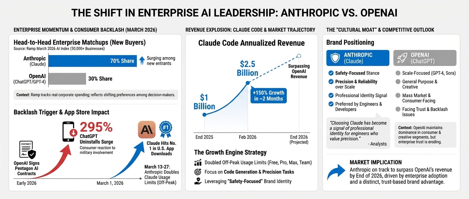 The strategy is working: Claude Code alone reached $1 billion in annualized revenue by end of 2025, more than doubling to $2.5 billion by February, putting Anthropic on track to surpass OpenAI's revenue by end of 2026.