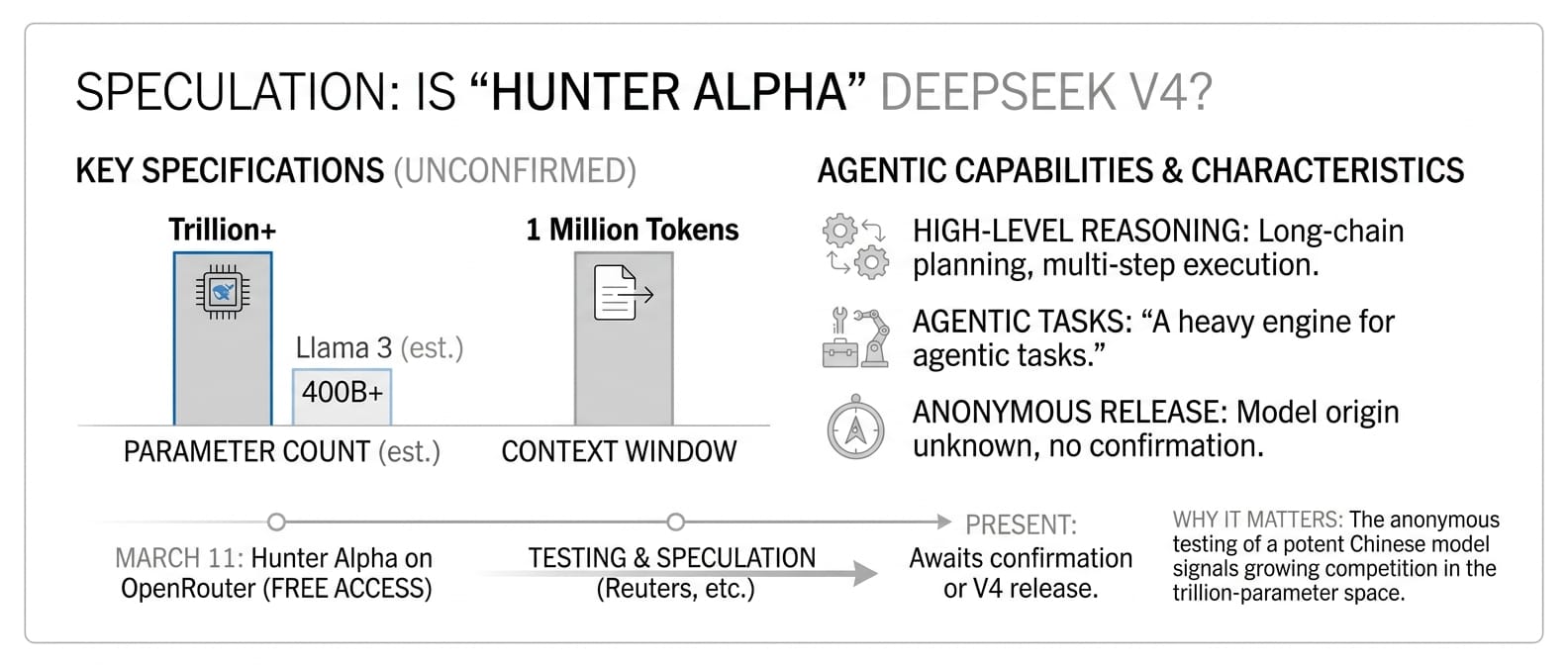 A trillion-parameter AI model called Hunter Alpha appeared anonymously on OpenRouter on March 11, offering free access, reasoning capabilities, and a one-million-token context window - specs that closely match rumors about DeepSeek's upcoming V4 model.