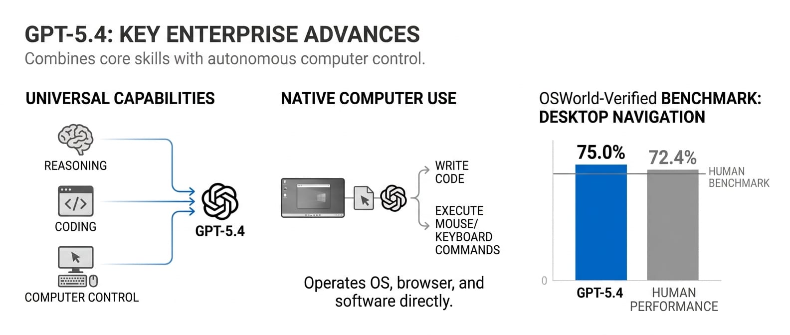 GPT-5.4 is OpenAI's first universal model with native computer use capabilities, operating websites and software systems by writing code or executing mouse and keyboard commands in response to screenshots.