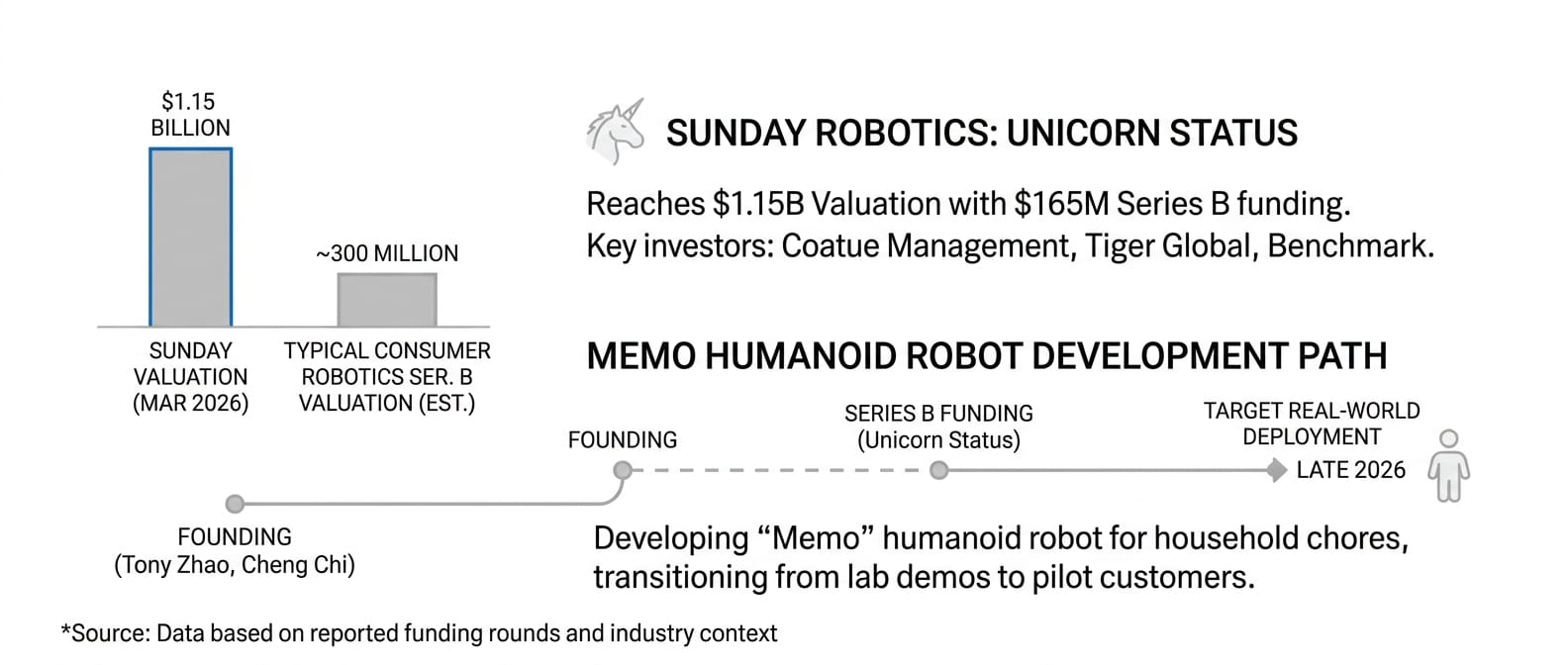 Household robotics startup Sunday reached unicorn status with a $165 million Series B funding at a $1.15 billion valuation, with Coatue Management leading the round and participation from Tiger Global, Benchmark, Bain Capital Ventures, and Fidelity.