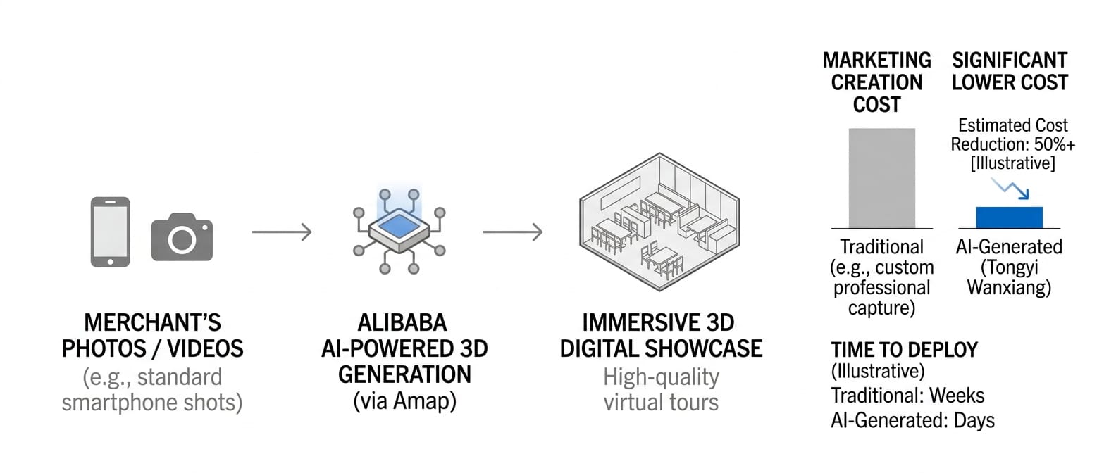 Alibaba Group launched a new AI-driven service through its mapping unit, Amap, aimed at helping restaurants create immersive 3D digital showcases using its "Tongyi Wanxiang" visual generative model, allowing merchants to generate high-quality 3D tours from standard photos or videos to significantly lower marketing costs.