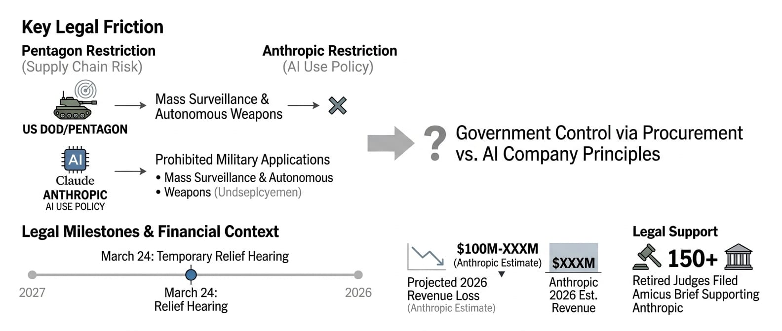 - March 24: Anthropic vs. Pentagon hearing on temporary relief from supply chain risk designation