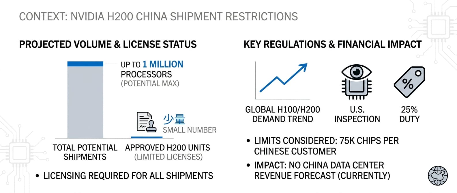 The Trump administration has allowed Nvidia and Advanced Micro Devices (NASDAQ:AMD) to sell less-powerful versions of their chips into China, though shipments still require government licenses. Previously, Nvidia said it had secured only one license to ship a small number of H200 units, and the company is still not including any China data center revenue in its financial forecasts despite the recent progress. H200 shipments are subject to US inspection and a 25% duty, and officials are considering limits of 75,000 chips per Chinese customer, with total shipments potentially reaching up to 1 million processors.