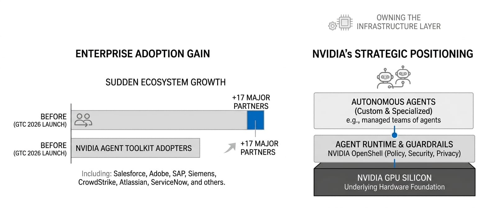 NVIDIA announced its Agent Toolkit at GTC 2026, an open-source platform for building autonomous AI agents that has been adopted by 17 major enterprise software companies including Adobe, Salesforce, SAP, ServiceNow, Siemens, CrowdStrike, and Atlassian.