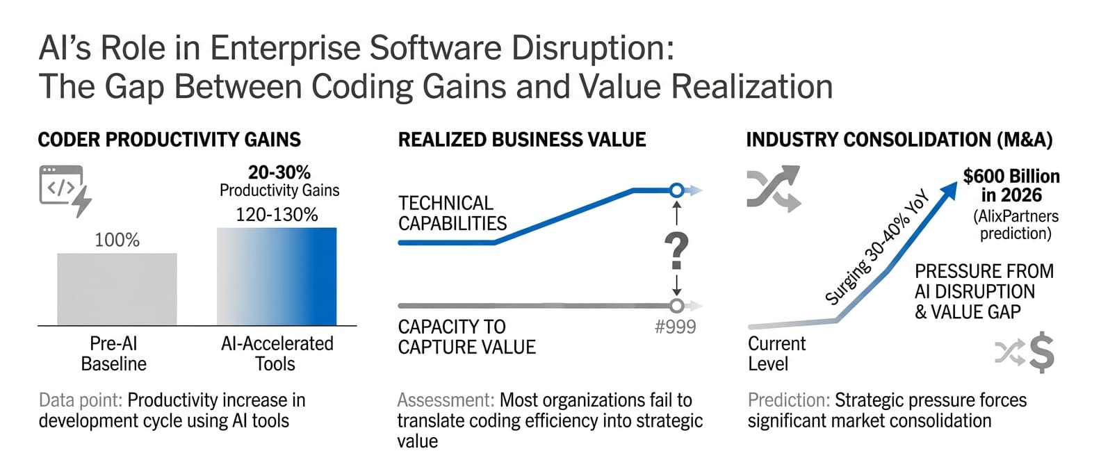 AlixPartners predicts mid-market enterprise software companies will face unprecedented pressure as AI forces consolidation, with M&A activity surging 30-40% year-over-year to reach an estimated $600 billion in 2026, despite finding that while AI-accelerated coding tools deliver 20-30% productivity gains, most organizations are failing to capture strategic business value.