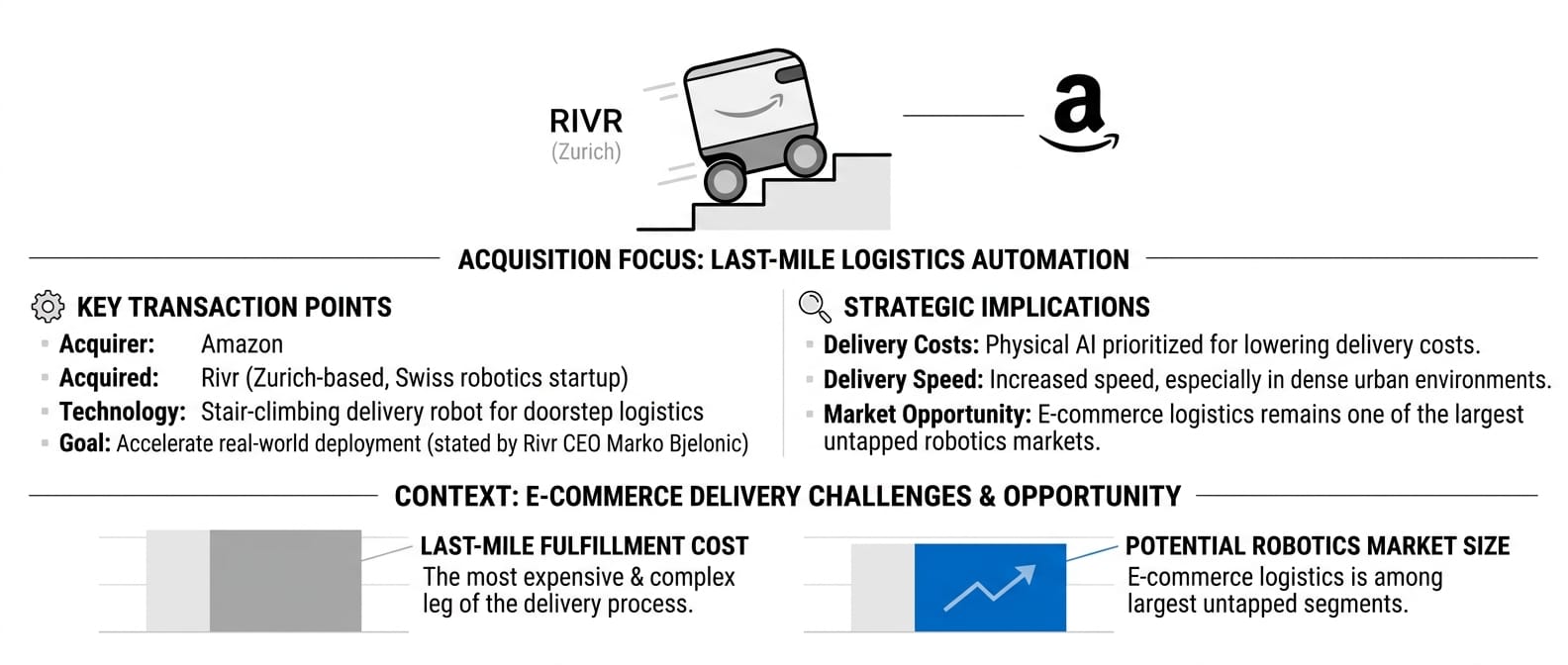 The acquisition signals Amazon still sees physical AI as essential to lowering delivery costs and increasing speed, especially in dense urban environments, as e-commerce logistics remains one of the largest untapped robotics markets.