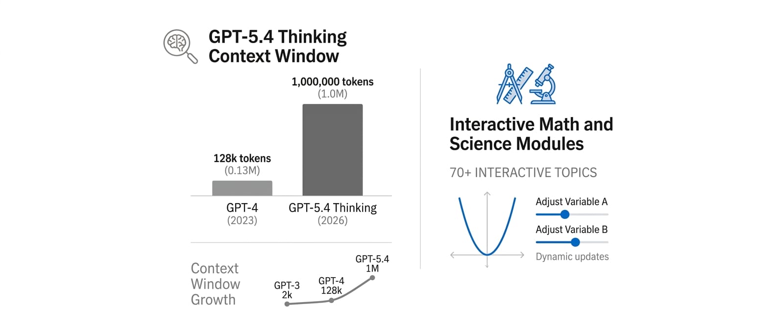 OpenAI's GPT-5.4 Thinking is now the flagship model with improved reasoning, coding, and agentic workflows supporting up to 1 million tokens of context, while ChatGPT launched interactive math and science modules for 70+ topics where users can adjust variables and see results in real time.