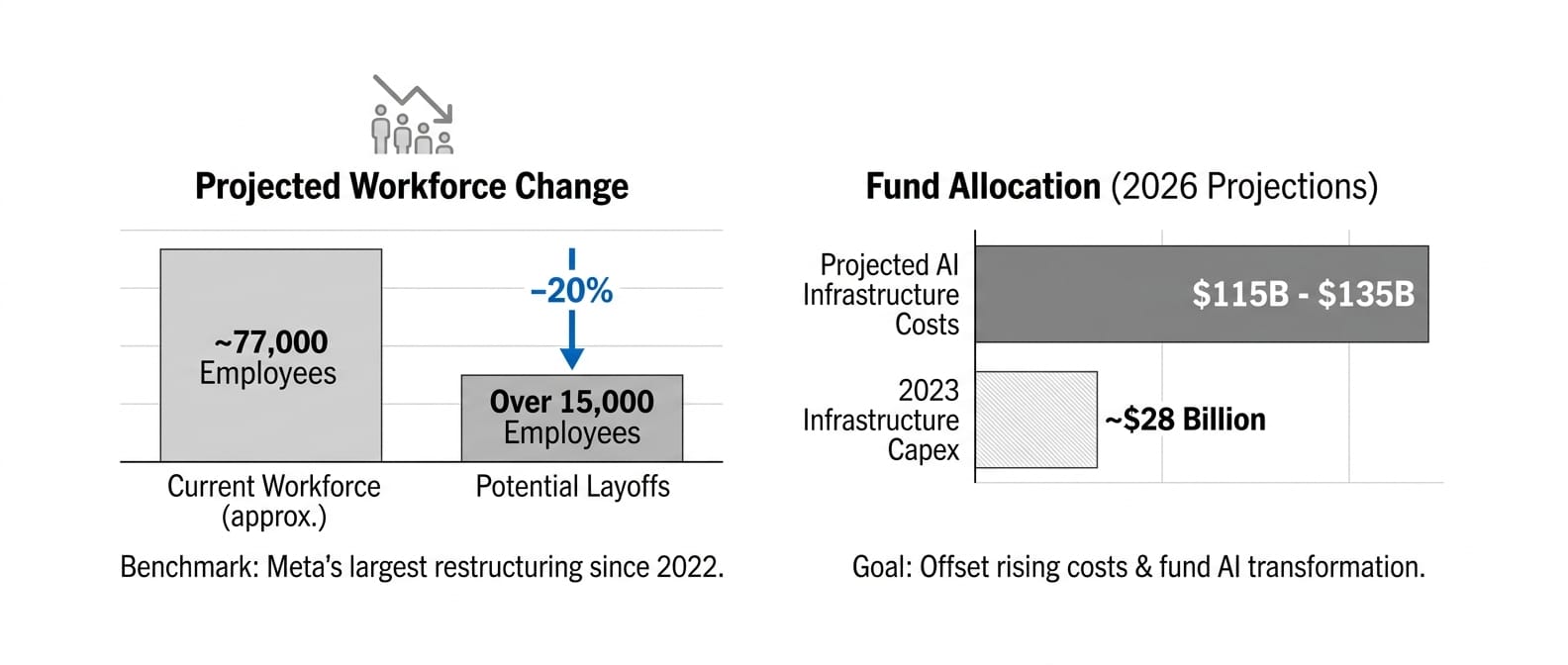 Meta is reportedly planning layoffs affecting at least 20% of its workforce - potentially over 15,000 employees - to offset rising AI infrastructure costs projected between $115-135 billion for 2026.