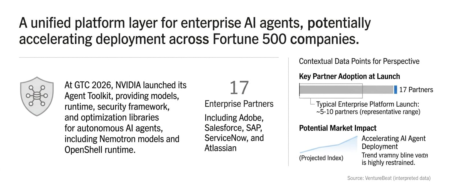 At GTC 2026, Nvidia launched its Agent Toolkit with 17 enterprise partners including Adobe, Salesforce, SAP, ServiceNow, and Atlassian adopting the platform.