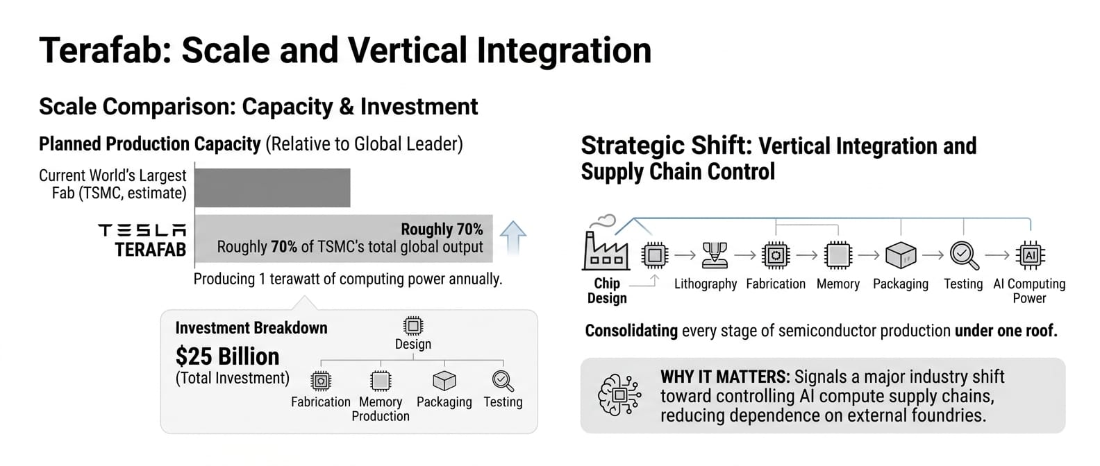 TERAFAB is designed to consolidate every stage of semiconductor production under one roof, including chip design, lithography, fabrication, memory production, advanced packaging, and testing. At full capacity, the facility would scale to roughly 70% of the global output from the current world's largest semiconductor foundry from Taiwan Semiconductor Manufacturing Company (TSMC).