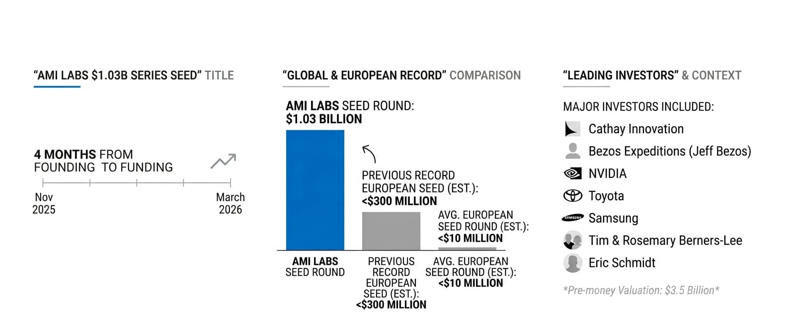 Advanced Machine Intelligence Labs, AMI, pronounced like the French word for "friend", announced its seed round on 10 March 2026, just four months after its founding. The round values the company at $3.5 billion on a pre-money basis and is believed to be the largest seed round ever raised by a European startup.