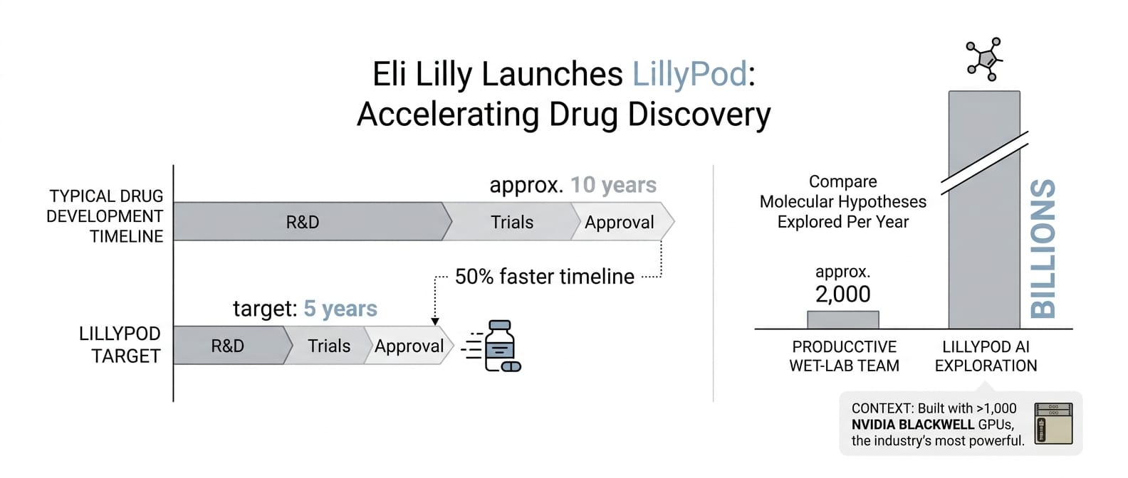 By automating clinical trial tasks like patient enrollment and optimizing manufacturing processes, he hopes Lilly can cut the typical 10-year timeline for a new drug down to five years. Lilly leaders framed LillyPod not as IT infrastructure but as a new kind of research instrument, one that lets scientists explore billions of molecular hypotheses in parallel, compared to the roughly 2,000 a productive wet-lab team can test per target per year.