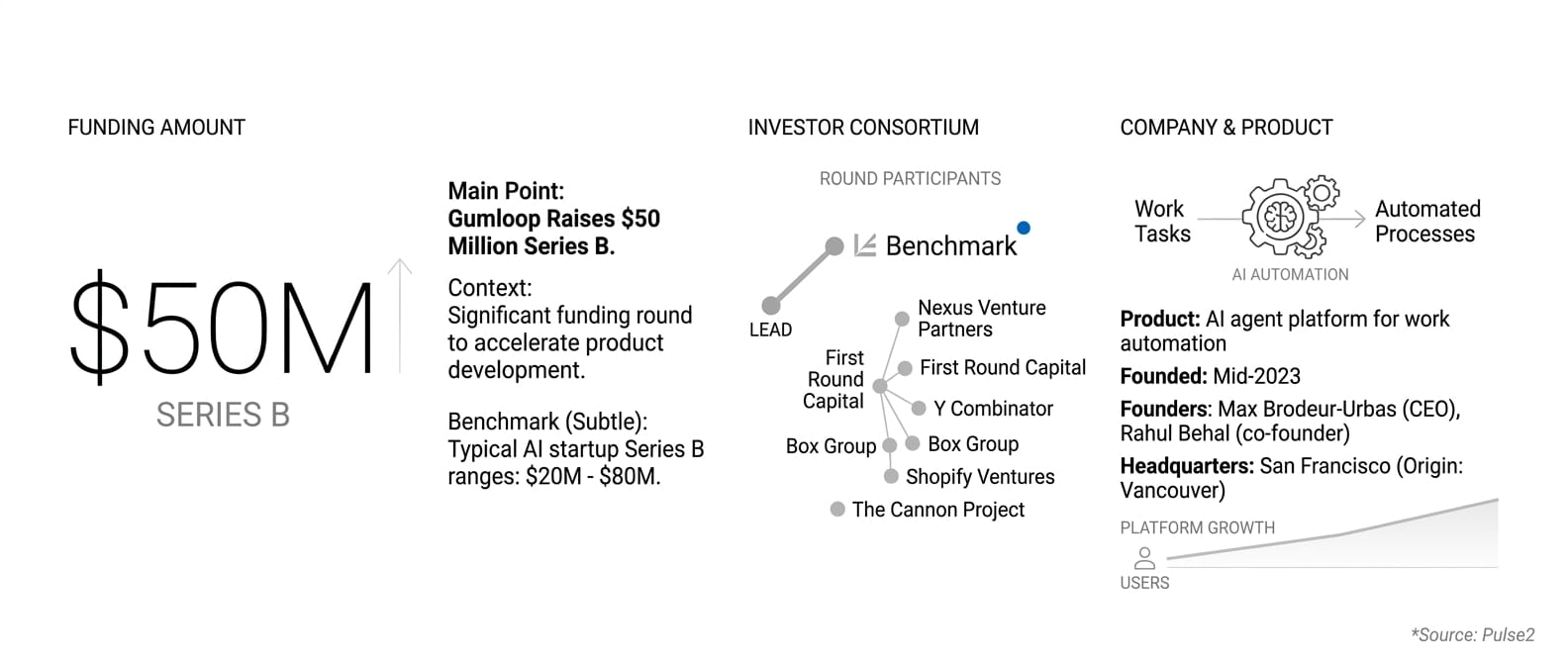 Gumloop announced it has raised $50 million in Series B funding to expand its AI automation and agent platform designed to help employees automate work tasks. The round was led by Benchmark, with participation from Nexus Venture Partners, First Round Capital, Y Combinator, Box Group, The Cannon Project, and Shopify Ventures.