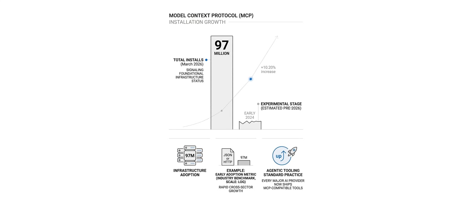 MCP reached 97 million installs, cementing it as infrastructure: The Model Context Protocol crossed 97 million installs in March 2026, signaling its transition from experimental standard to foundational agentic infrastructure. Every major AI provider now ships MCP-compatible tooling.