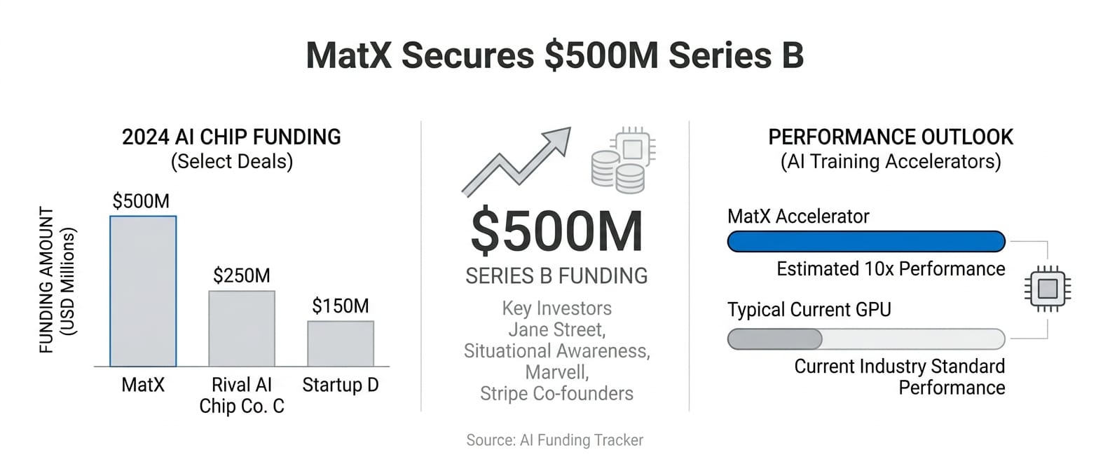 MatX secured $500 million in Series B led by Jane Street and Situational Awareness - one of the largest AI chip financing deals to date. Strategic backers include chipmaker Marvell and the Stripe co-founders. MatX secured $500 million in Series B led by Jane Street and Situational Awareness - one of the largest AI chip financing deals to date. Strategic backers include chipmaker Marvell and the Stripe co-founders. Its accelerators promise roughly 10× the performance of current GPUs for AI model training, positioning MatX as a serious challenger to Nvidia in the AI training market.
