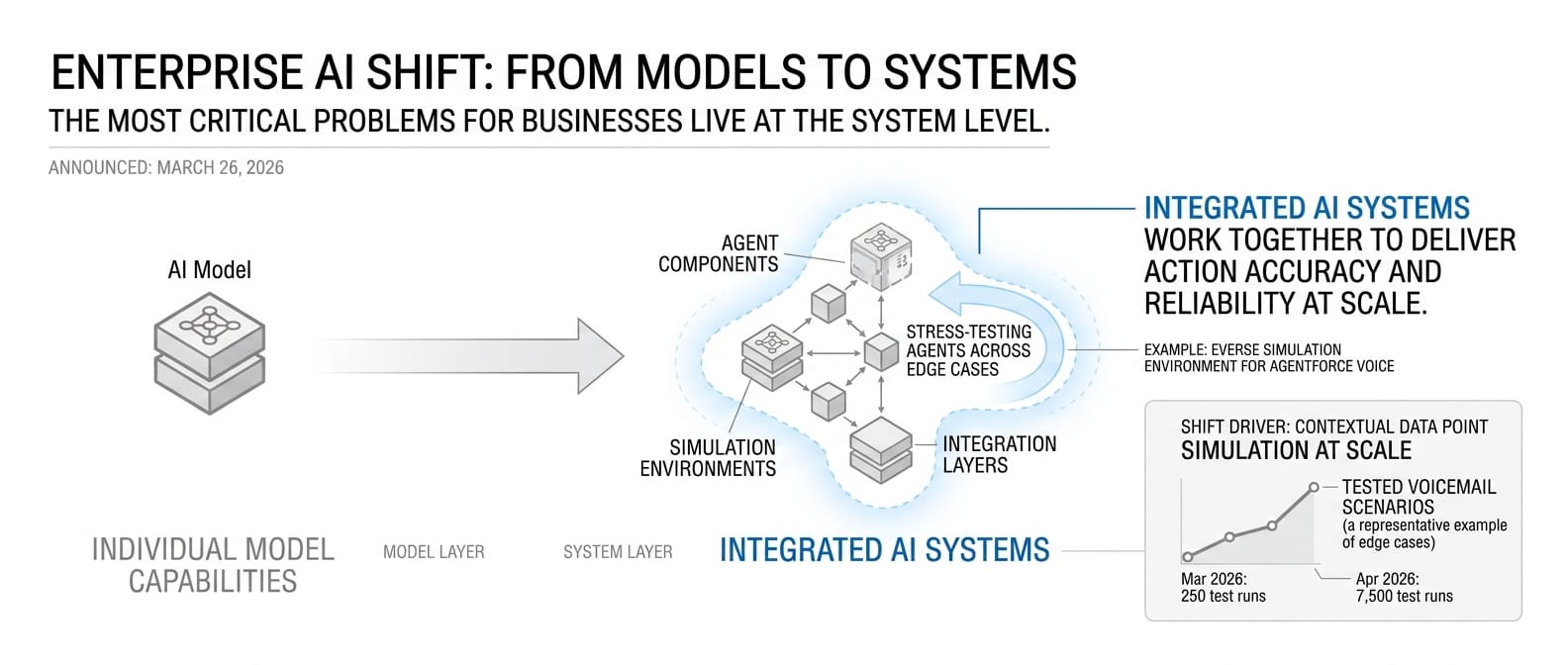 Salesforce AI Research announced AI Foundry on March 26, 2026, an initiative focused on developing transformative AI innovation for enterprise applications. Chief Scientist Silvio Savarese emphasized that "the problems that matter most for businesses don't live at the model level anymore," but "at the system level, where components work together to deliver accuracy, consistency, and reliability at scale."