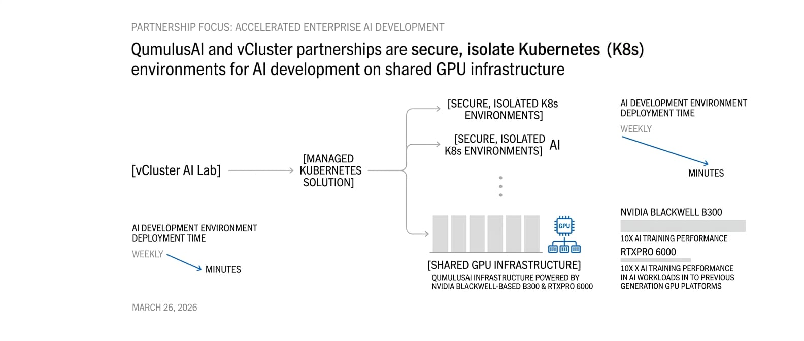 QumulusAI announced a partnership with vCluster on March 26, 2026, to enable developers to quickly create secure, isolated Kubernetes environments for AI development. The companies established the vCluster AI Lab and QumulusAI will offer a managed Kubernetes solution powered by vCluster technology, allowing enterprises to deploy isolated Kubernetes environments on shared GPU infrastructure.