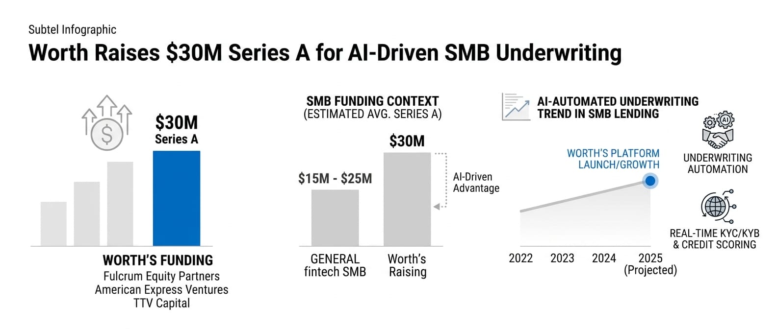 Worth, a New York-based fintech, raised $30 million in Series A funding to automate small-business underwriting. Led by Fulcrum Equity Partners with American Express Ventures and TTV Capital participating, Worth offers an AI-driven platform that consolidates KYC/KYB checks, credit scoring, and fraud detection into a real-time engine.