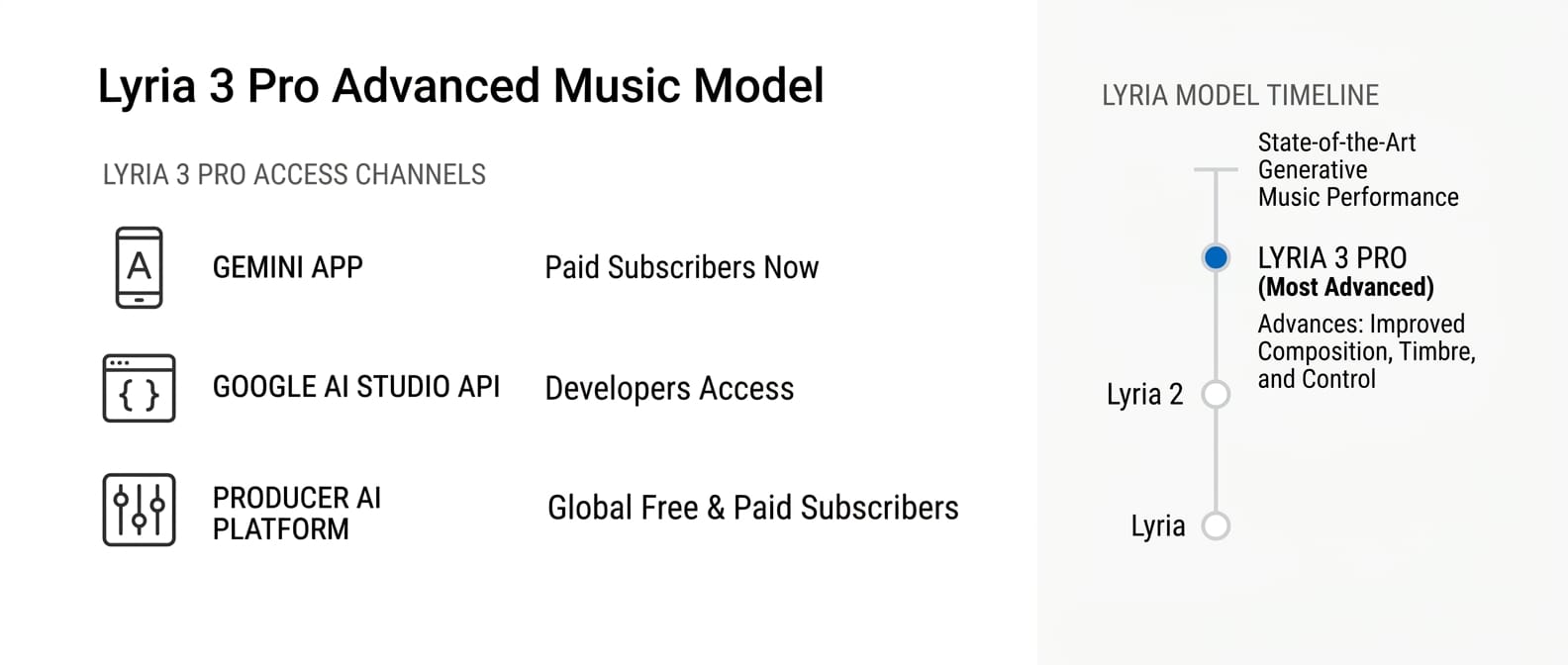 Google introduced Lyria 3 Pro, its most advanced music model from Google DeepMind. Lyria 3 Pro is rolling out now to paid subscribers in Gemini App, to developers via the API in Google AI Studio, and globally to free and paid subscribers in Producer AI platform for creating and refining music using generative AI.