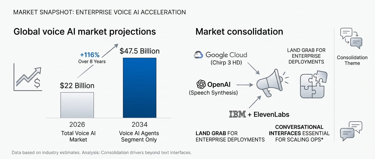 ElevenLabs and IBM announced a collaboration just this week to bring premium voice capabilities into IBM's watsonx Orchestrate platform. The market underpinning all of this activity is enormous - voice AI crossed $22 billion globally in 2026, with the voice AI agents segment alone projected to reach $47.5 billion by 2034, according to industry estimates.