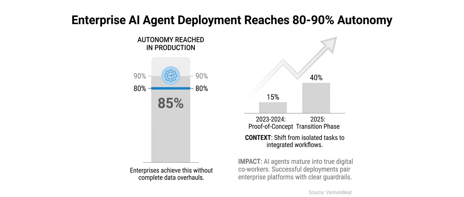 Enterprises are getting AI agents to 80-90% autonomy in production without multi-year data overhauls. Companies are successfully deploying near-autonomous AI agents in production environments without requiring complete infrastructure overhauls. Where adoption succeeded, businesses paired enterprise-grade platforms with clear guardrails, allowing agents to combine predictive insight, generative capability and autonomous action across systems.